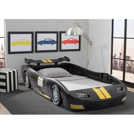 Sweet dreams are just around the corner with the Turbo Race Car Twin Bed from Delta Children! Designed to resemble a classic race car, fun details include a rear spoiler, a front grill, and racing tires with chrome-colored rims. Made of durable molded plastic and decorated with cool decals, this sleek bed will kick any car-themed room into high gear for years to come. The high sides of the race car act as secure guardrails and allow kids of all ages to easily enter and exit the bed. Perfect for any child who dreams of racing cars, the Turbo Race Car Twin Bed from Delta Children will have your little one speeding off to sleep each and every night.