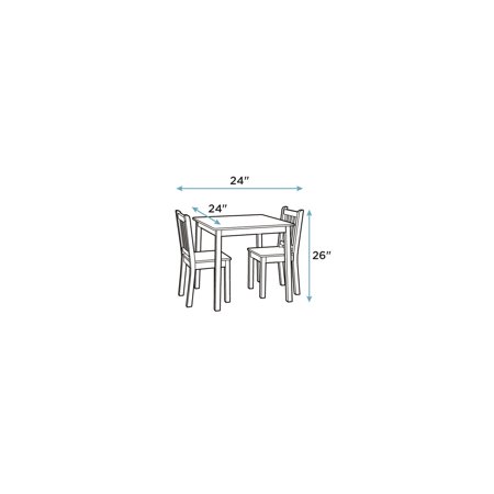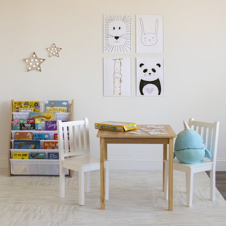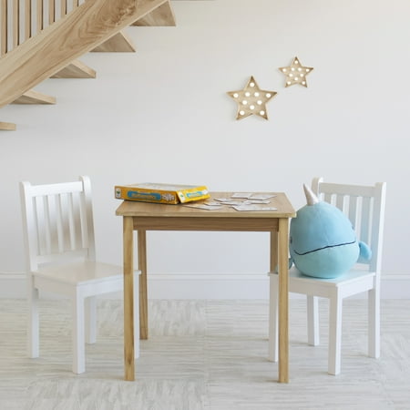 Perfectly sized to meet your growing childs needs, the Humble Crew Journey Kids 3-piece Square Table and Chair Set is sturdy, stylish and simple to clean. This childrens table and chairs set can be used as a homework study desk, an arts and crafts activity center, or a board game table. It is also a great homeschooling solution for young grade school aged students doing online school from home. The set includes a square natural wood grain table and two white chairs, a contemporary and versatile finish sure to complement your home's existing dcor. From snack time to playtime this set will quickly become your little one's very own favorite spot in the house to draw and color, do puzzles, host tea parties, play cars and trucks, and more. This furniture set is easy to assemble with all hardware included. The sturdy table and chairs feature solid wood legs for additional support and long-lasting durability, ideally sized for boys and girls between 6 and 10 years old. Product Sizing Table Height: 23" Table Top: 24"W x 24"D Chairs: 12"W x 12"D x 26"H Chair Seat Height: 13" Each chair holds up to 70 lbs.