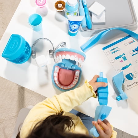 Smile, the dentist will see you now! This 25-piece dental care play set features an over-sized set of pretend teeth so young dentists-in-training can give cleanings, treat cavities, and even fit retainers and braces! Mark the pretend teeth with the cavity stickers, then use the vibrating tool with interchangeable polishing and drill heads, and the toothbrush to clean. The set includes realistic instruments like a pick, mirror, and floss, a dental rinse bottle and cup, 2 gauze pads, 2 tooth polish cups, and an instrument tray to keep organized. A mask, reusable ID tag on a lanyard, and a double-sided reusable activity card round out the dentist’s office experience. The play set is a fun and engaging way to teach good dental health practices, and to ease kids’ fears or feelings of stress associated with a visit to the dentist. Spark a child’s creativity and imagination, and to inspire young dentists for years to come.