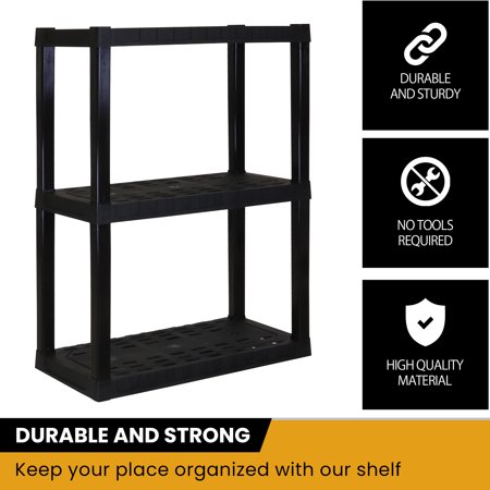 Maximize your storage space with this versatile 3-tier plastic shelving unit, proudly manufactured in North America. This lightweight garage shelf snaps together easily with no tools required, making assembly quick and hassle-free. Each heavy-duty moulded plastic resin shelf holds up to 100 lbs (45 kg), providing sturdy and reliable storage for a wide range of items. Whether you're reorganizing your shoe collection, decluttering the tool shed, or spring cleaning the toy room, Hyper Tough plastic shelves offer the perfect shelving solution to help keep your space neat and organized.