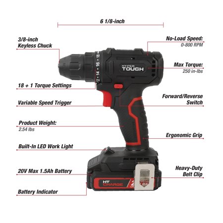 The Hyper Tough 20V Max 1.5AH Cordless Drill is your go-to tool for tackling a variety of tasks around the house or on the job site. Designed with a 3/8-inch keyless chuck, this drill allows for quick and easy bit changes, saving you time on your projects. The built-in LED work light provides excellent visibility in low-light areas, while the belt clip adds convenience by keeping the tool within easy reach. With 18+1 torque settings and a no-load speed of up to 800 RPM, this drill offers the versatility and power you need for both delicate and heavy-duty tasks. Delivering a maximum torque of 250 in-lbs and weighing only 2.54 lbs, it's the perfect lightweight tool for any DIYer or professional.