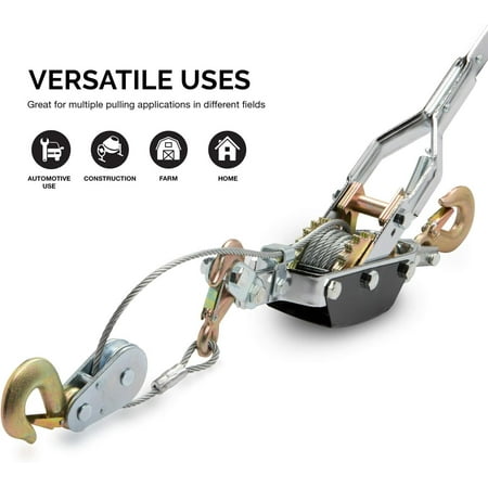 NEIKO presents the 02256A Heavy Duty Manual Come Along Cable Puller. This comealong manual winch is capable of pulling ten thousand pounds. Convenient and portable enough to use in almost every situation, small enough to carry with one hand and light weight so you can fit it in your trunk. Pull large loads and vehicles of whatever you are stuck in. You can also use them for stretching fences, lifting objects, and lowering objects. Some more advanced uses are also pulling joints together, pulling frame of a new construction together during its raising, or straightening heavy panels while putting them in place. Works in the industrial and construction fields, on boats and ships. With its long hand operated ratchet lever winch gets all the leverage you need.