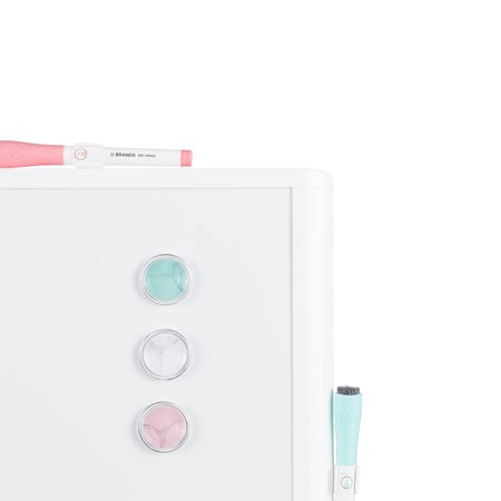 The U Brands 17" x 23" plastic frame magnetic dry-erase board brings a clean, modern profile to a classic whiteboard. Featuring a premium magnetic surface and framed in durable plastic, this board works as a blank canvas to jot notes and ideas or simply a place for creative design. The pack includes everything needed to personalize your board. Dry-erase markers with built-in erasers keep the board clean and bright, and marble printed magnets allow the board to do double duty as a bulletin board. Whether it's a functional way to keep life on track or a place for doodling, you can't go wrong with this essential board. So jot down your plans, let your family and friends know what's cooking, or just get creative the old school way. Stay organized and share ideas with this magnetic dry-erase whiteboard. 17" x 23" board size. Magnetic dry-erase surface is highly durable, erases easily, resists staining, ghosting, and duals as a bulletin board with magnets included. White plastic frame adds a touch of style to any room. Easily mounts vertically or horizontally with included hassle-free mounting hardware and instructions; no drills required. Package includes: whiteboard, three magnets, four dry-erase markers with built-in eraser, and two Gruv clips. Perfect for moderate to heavy use in an office, at home, or any commercial environment. Board surface won't stain and is super easy to clean. Write-and-wipe surface will not ghost to prevent it from dulling. Works well with all dry-erase markers. Surface accepts magnetic accessories. 3-year manufacturer limited warranty. Sold as 1 Each.