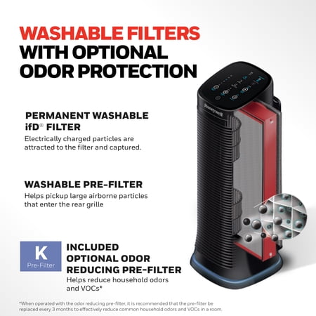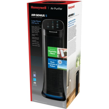 The Honeywell AirGenius 5 Air Purifier is a powerful and efficient air purifier for large rooms, helping to capture up to 99.9% of microscopic airborne particles, including dust, pollen, pet dander, dust mite debris, and smoke.* Ideal for large rooms up to 250 sq. ft., this quiet air purifier for home circulates air up to 4.8 times per hour to deliver cleaner, fresher air — especially helpful for homes with pets, allergens, or stale air. Designed with a washable permanent ifD® filter and washable foam pre-filter, this low-maintenance air purifier eliminates the need for replacement filters, saving you time and money.*** It features five air cleaning levels, including Sleep, Germ, General Clean, Allergen, and Max, as well as user-friendly functions like a floor accent light, oscillation, and an auto-off timer with 2, 4, 6, 8, 10, and 12-hour options. This air purifier is AHAM Verifide with a high smoke CADR. Whether you’re looking for a pet air purifier, a filterless air purifier alternative, or a washable filter air cleaner for everyday use, the Honeywell AirGenius 5 is a smart choice for year-round comfort and wellness.