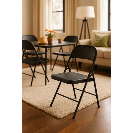 Add reliable seating anywhere with the Mainstays Metal Folding Chair in Black. Designed with a durable powder-coated steel frame, this chair provides sturdy support for up to 250 lbs while maintaining a lightweight build. The contoured seat and backrest ensure comfort during use, while the sleek black finish complements any setting. Its folding design allows for easy storage in closets, under beds, or stacked with other chairs, making it an excellent choice for homes, offices, events, or outdoor gatherings. Whether you need extra seating for a party, a quick setup for meetings, or a portable chair for camping and picnics, the Mainstays Metal Folding Chair delivers dependable strength, versatility, and convenience.