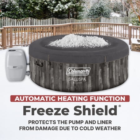 Sink into the warm, bubbling Coleman® SaluSpa® Bahamas AirJet™ 4 hot tub, created by the world’s first portable hot tub manufacturer. A relaxing soak in heated water is great for releasing muscle tension and supporting exercise recovery. The AirJet system features 120 jets that release bubbles from the bottom of the tub to create a relaxing environment. MaxHold™ fabric internal beams provide superior air pressure retention, stability and lightweight portability. The external wall is constructed with 3-layer Tritech® material, proven to be both puncture and damage resistant. Designed with innovative Freeze Shield® technology, internal temperatures stay just above freezing when not in use to prevent damage during colder seasons. This hot tub set features a multi-function pump that runs the inflation, heating and filtration systems, ChemConnect® dispenser that maintains the appropriate chemical level, and a reinforced cover to keep heat in and debris out. Electrical Safety Information: Our spas feature a Ground Detection System that ensures the spa is used with an outlet having a proper ground connection, providing additional electric current protection. Only use a grounded socket corresponding to the electrical rating of the attachment plug (110-120V AC, 60Hz, Single Phase 12A at 68ºF). NEVER use an extension cord or multi-plug adaptor. Be sure to regularly inspect both the plug and socket for signs of damage, and do not plug the product back into the socket if damage is found. Read the manual thoroughly before setting up your hot tub. Outdoor installation is preferred; Indoor installation has special requirements. ATTENTION: Shipping restrictions may apply. This model is not available for sale in the following states: CA, MA, ME, NJ, NV, NY, OR, RI. Residents of these states may select the comparable Bestway model sold with energy-efficient EnergySense® thermal cover to avoid cancellation.