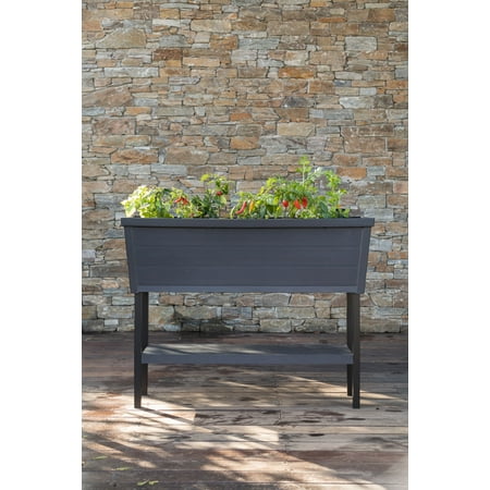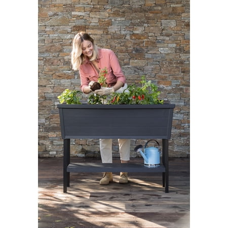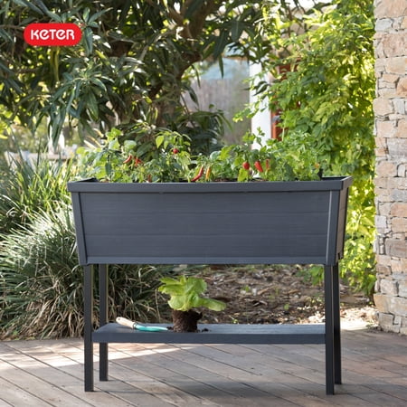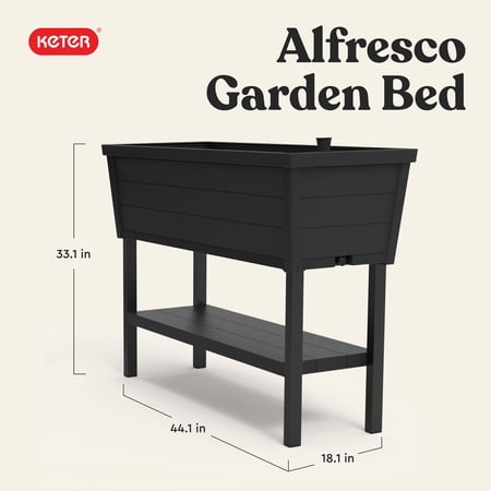 The Alfresco Garden Bed by Keter makes it simple to bring fresh greenery and life to your patio, balcony, deck, or backyard. Its raised height, supported by durable metal legs, allows you to care for your plants comfortably, eliminating the need to kneel or crouch. Perfect for growing vegetables and herbs, this garden bed combines functionality with style to enhance any space. With a smart self-watering system and an easy-to-read water gauge, your plants stay perfectly hydrated without the risk of over- or under-watering. The built-in drainage tab ensures proper water flow and makes transitioning the planter indoors mess-free. Featuring a wood-look finish and heavy-duty resin construction, this garden bed is both beautiful and long-lasting, resisting rust and rot for years of reliable use. Grow your favorite vegetables and herbs effortlessly with this elevated garden bed designed for convenience and durability.