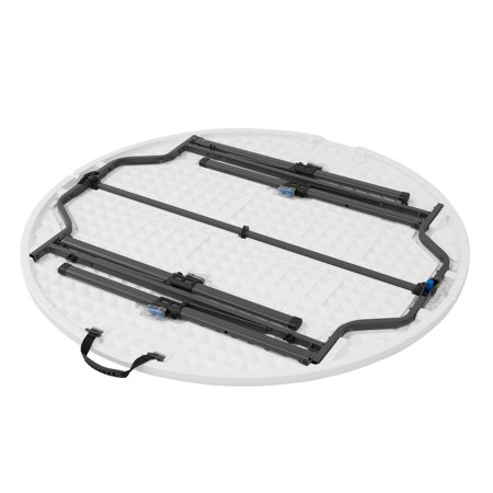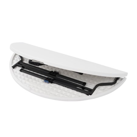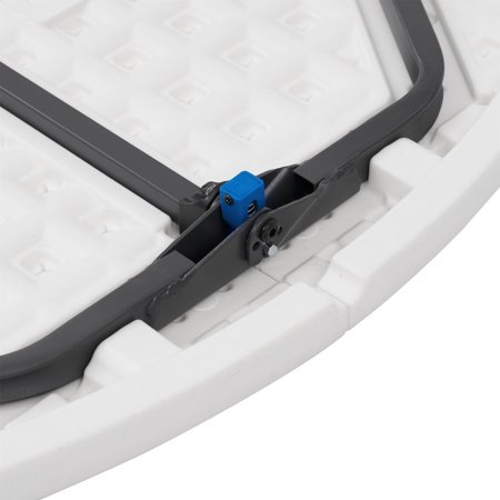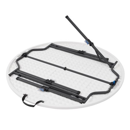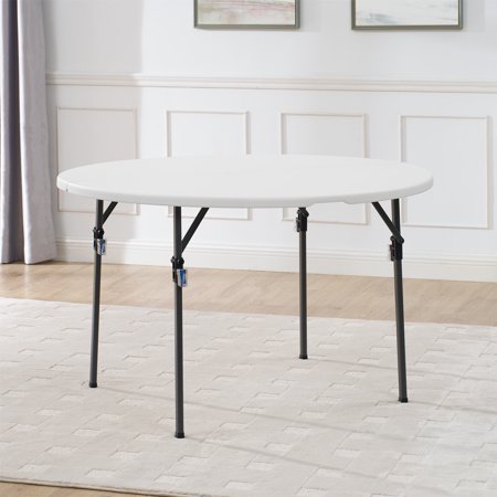 This lightweight Mainstays 4-foot fold-in-half round table is a fantastic choice at any number of events. It offers an ample 48" diameter and a classic white resin surface for lasting durability and easy clean up. Sets up in seconds and our pinch free button allows for easy collapsing of legs. Features an auto locking and unlocking system for folding, plus the carry handle makes it ideal for taking it on-the-go. Perfect for indoor or outdoor use. Add a bit of elegance to your event with this Mainstays 4 ft fold-in-half round table.