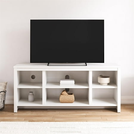 Update your entertainment experience with the Mainstays Parsons TV Stand for TVs up to 50" wide. This simple, modern TV Stand is crafted with clean lines and a minimalist aesthetic and boasts six open shelves for displaying media devices or decor. Say goodbye to cable clutter with convenient wire management cutouts in the back four of the shelves. Constructed from laminated engineered wood, it offers sturdy support for your TV while seamlessly blending into any modern living space. This TV Stand requires assembly upon delivery. Two adults are recommended for proper assembly. Once assembled it measures to be: 19.7"H x 45.5"W x 15.75"D.