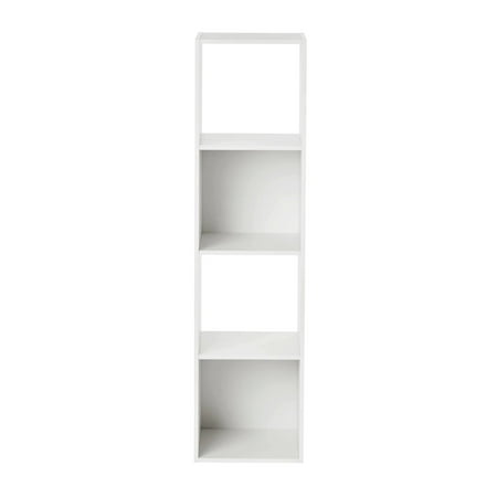The Mainstays 4-Cube Vertical Storage Organizer features four compartments perfectly sized for storing and displaying office supplies, books, clothes, craft supplies, photos, collectibles and so much more! This sturdy bookcase can stand vertically or horizontally to best suit your needs and space. They are compatible with Mainstays 10.5" x 10.5" collapsible storage bins and cube inserts (sold separately) and available in multiple finishes. Two open back cube shelves make managing cords and cables easy, while two closed back shelves help keep items securely housed. This functional and stylish cube shelving system is the ideal home storage solution for your living room, family room, home office, playroom, closets and more.