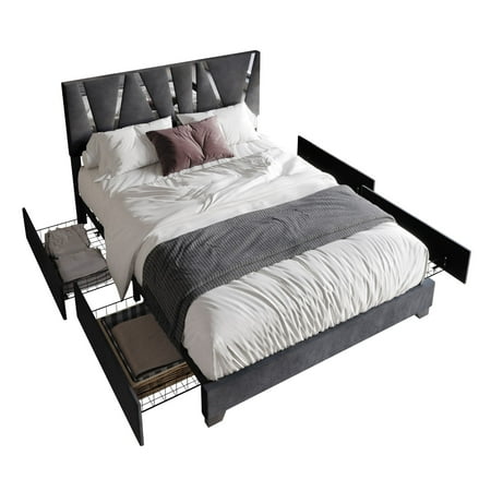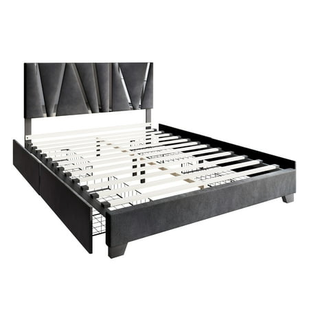 Elevate your bedroom aesthetic with our upholstered storage platform bed, where luxury and functionality blend effortlessly. The velvet-upholstered headboard, featuring striking silver acrylic strip accents, adds a touch of glamour and sophistication to your sleep space. Designed for practicality, the bed includes four spacious under-bed drawers, providing ample storage for bedding essentials, clothing, or personal items, helping you maintain a tidy, clutter-free environment. Built with a full slat system, this platform bed offers exceptional support and comfort, ensuring a restful night’s sleep without the need for a box spring. The perfect combination of style and functionality, this bed is a must-have addition to any modern bedroom.