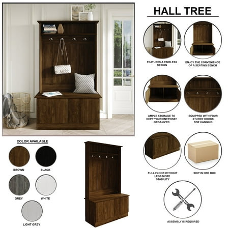 Enhance your space with our Castle Place multipurpose hall tree. Its timeless design complements any interior, offering ample storage. The double prong hook ensures effortless organization. Crafted from solid and engineered wood, it blends durability with sophistication. The legless full-floor design enhances stability and simplifies cleaning. With a built-in bench or seating area and two cabinets with doors, convenience meets elegance. Available in Dark Grey, Light Grey, Brown, Black, and White, it ships in one box for easy assembly and delivery. Product dimension: 39.96L x 15.57W x 67.13H (Weight capacity: 300 lbs)