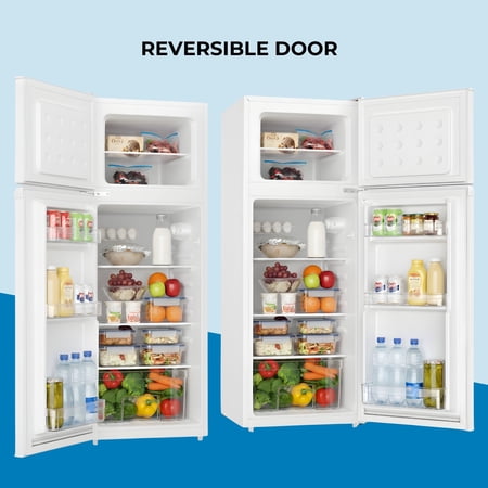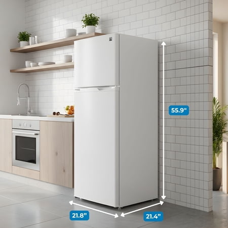 Product Overview The Kenmore 7.5 cu. ft. Top Freezer Refrigerator is a practical solution for smaller spaces that still need reliable food storage. Designed with a compact footprint, this dual-door refrigerator fits easily in apartments, condos, offices, dorm rooms, or secondary kitchen areas.Energy Star certified compressor cooling helps maintain consistent temperatures while using less energy. Inside, adjustable glass shelves, a full-width crisper drawer, and door bins provide flexible storage for everyday groceries and beverages. The separate top freezer keeps frozen foods organized and easy to access.With a reversible door and recessed handle, this refrigerator adapts easily to different room layouts while maintaining a clean, modern appearance. Finished in classic white, it’s a dependable and space-saving choice for everyday refrigeration needs.