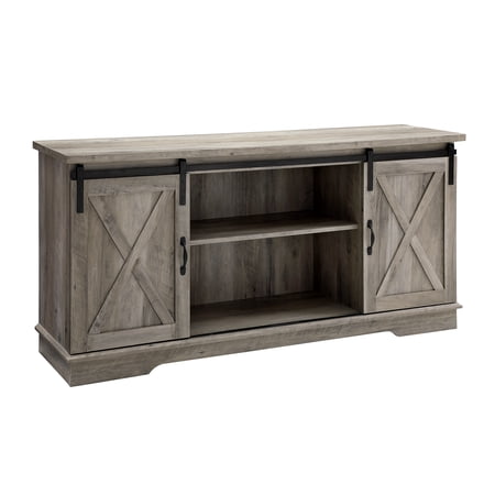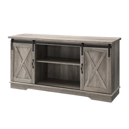 With a stand-out design, this 58 inch storage console from Manor Park will integrate style into your home. This TV stand will give your living room a charming country feel, while also providing plenty of storage space for your electronics and de9cor. Featuring two sliding barn door styled cabinet fronts for a versatile design where you can either close off the middle or both sides, depending on your needs. Adjustable shelving and cable management make it simple for you to keep your electronics in one place. This media console is constructed of high-grade MDF. The modern farmhouse style of this entertainment center will become a piece in your living room you?ll admire.